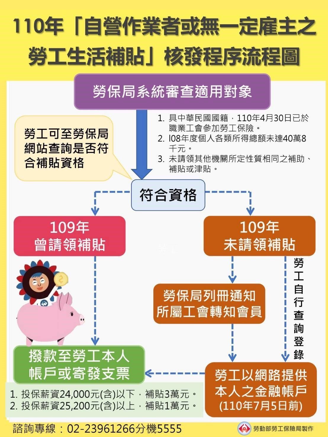110年「自營作業者或無依定雇主之勞工生活補助」核發程序流程圖